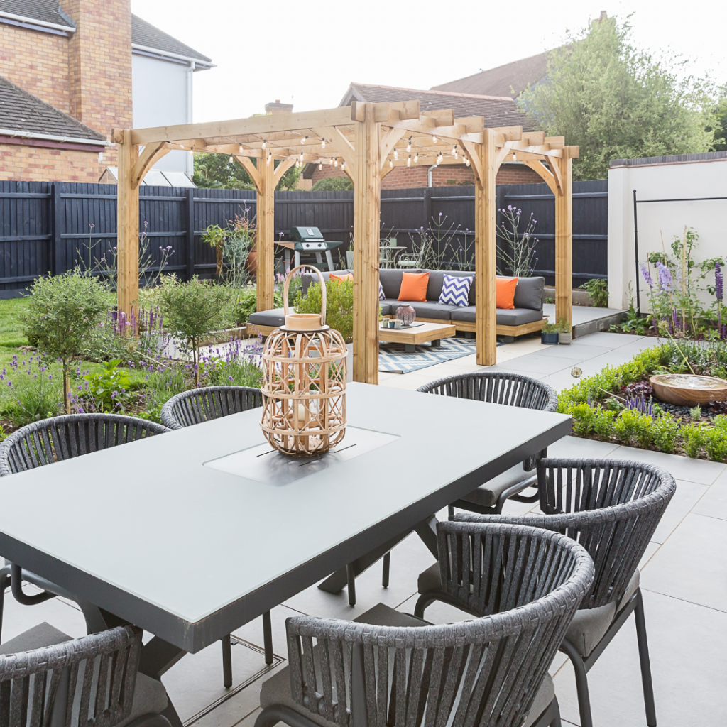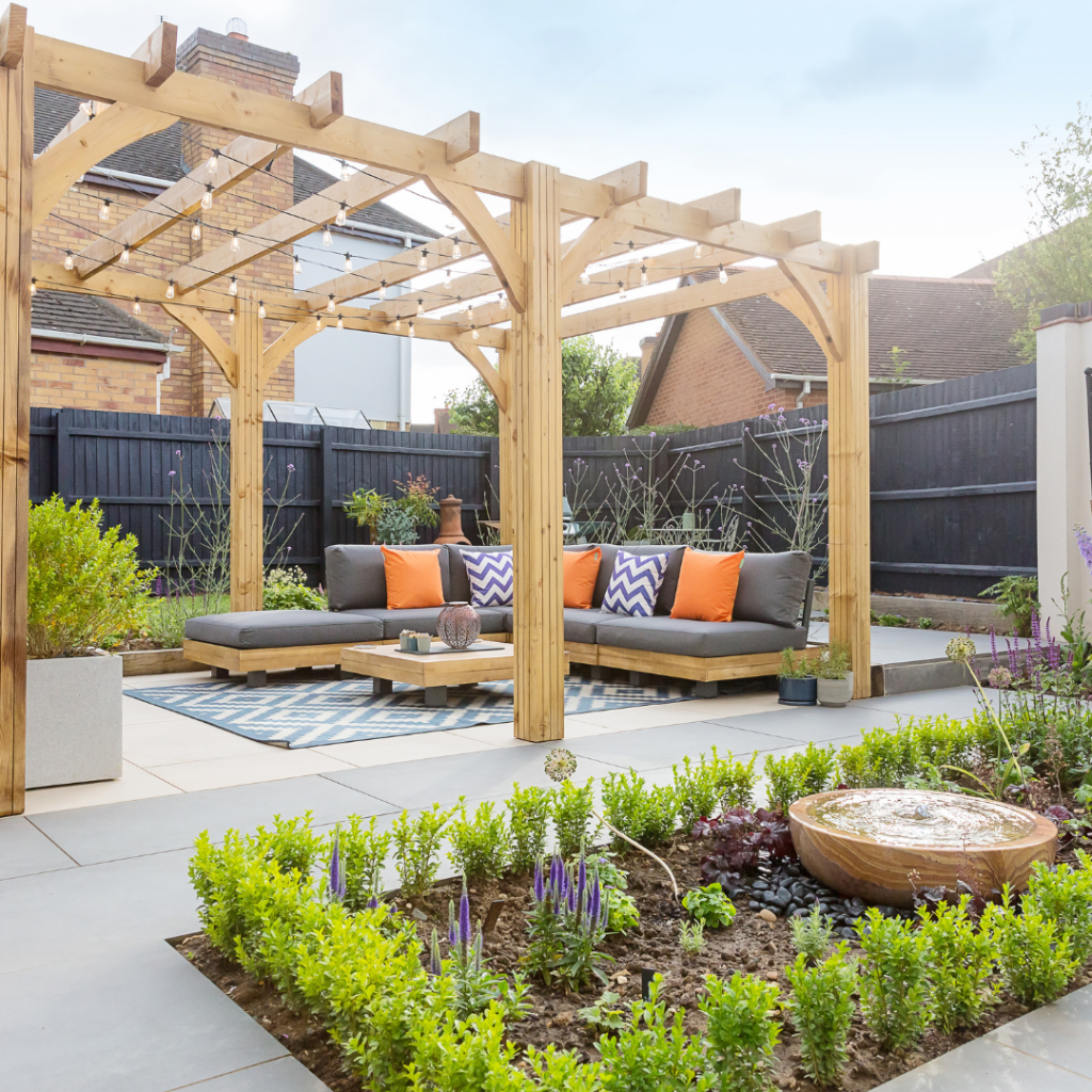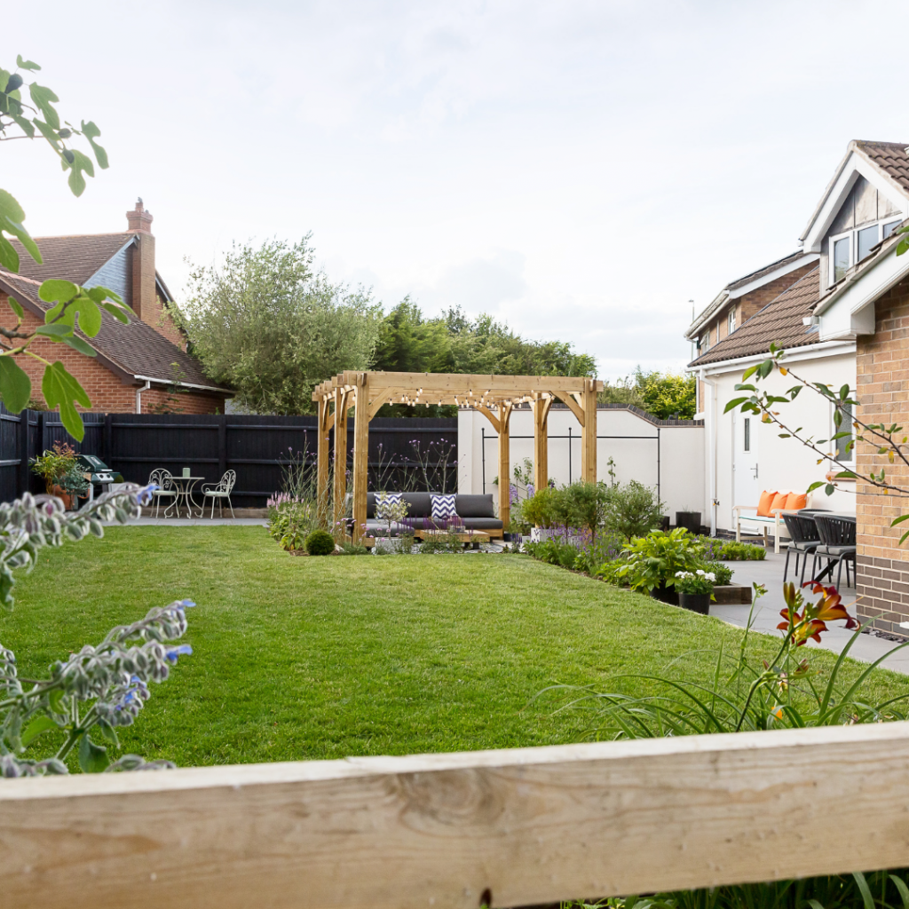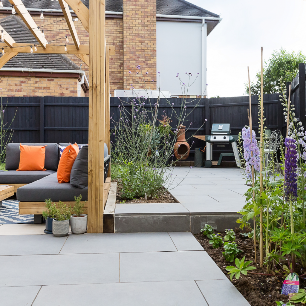 We used different coloured porcelain paving to divide the space and visually distinguish each area. The pergola not only added height but also created a shaded lounging spot. Sleeper edging was used to give the effect of a sunken seating area while also retaining the lawn and borders.