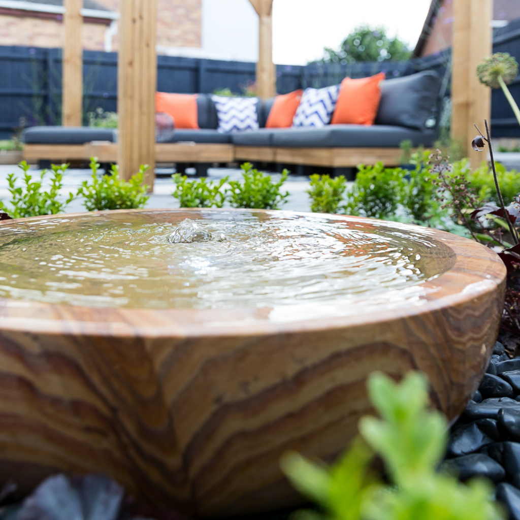 The client took on the planting themselves, and I think they did a fantastic job. The result is a well-organised, multifunctional garden that provides a range of uses, from dining and relaxing to gardening and play, all within a compact space. The water feature adds a peaceful touch, making the garden a perfect spot for enjoying both activity and calm.